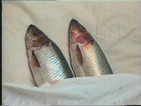 We borrowed a video camera and portapack to shoot on. Our favourite filming location was under the pier at Phoenix Wharf between the Barbican and Plymouth Hoe, on a rising high tide. All the interiors were shot in the living room of the tiny terraced house on Beaumont Avenue (owned by Bernard Samuels, then Director of Plymouth Arts Centre) in the early hours of the morning after we’d got back from a night out. The pair of mackerel I juggle and tenderly put to bed was bought on the fish stall at Plymouth Pannier Market, and the gloves are my own. The aquanaut was multiple reflections of the figure of Stuart, appearing out of the darkness from the back yard. For the edit, we paid 20 quid to hire an MX10 video mixer (with its Time Base Correction feature) for a day from Exeter Film and Video Workshop, so we could overlay some of the visuals. I went up to Exeter and back on the bus one day to pick up the mixer, then returned it via the train the next day. In a review of the 1990 screening at VIPER in Switzerland, the soundtrack was described as being by industrial noise group Test Dept. In fact, the soundtrack was composed by us. We made our field recordings on cassette using a Sony Walkman Pro, and then did a 2 track mix on the 2 machine Lo-band U-Matic edit suite that was locked away in a room on the first floor at Plymouth Arts Centre, following the closure of the Plymouth Video Workshop the previous spring. We let ourselves in, taking care not to stand on the creaky floorboard, edited the film very quietly over a post-production period of several days, and then secretly made our Lo-band U-Matic screening copies before leaving the building.