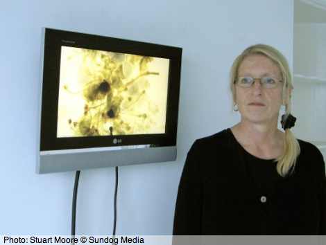 Screen two shows Verge: Flux made with colour reversal 16mm film. Plant forms seared into the film emulsion, the vibrant motility of x-rays looking deep into the heart of things, a deep ultraviolet shimmering resonance. The sound composition is derived from the noise of the wind blowing across the sign at the entrance to the empty retail park sited in a disused quarry passed on the route.Production notes