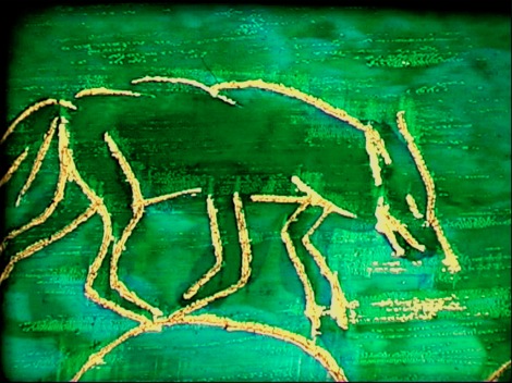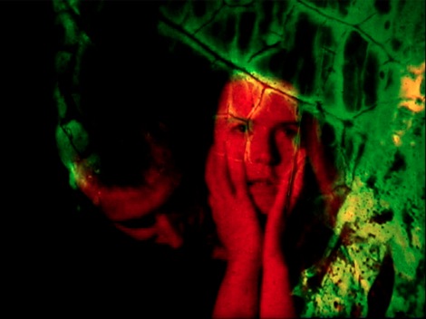 The filmed sequences are personalised by engraving and re-dyeing the emulsion: I project my memories onto the frames of the film, retracing history, what has been recorded, and assimilate the past. Leaf skeletons are bleached across skin. There are wastes of ice and snow captured in stop-motion, photographic sequences of facial movement: frozen moments of transformation. The wolves, monkeys and lizards are set free.