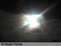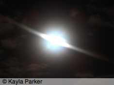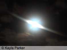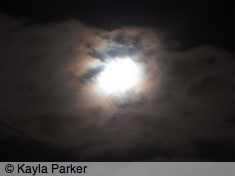 The full moon just before midnight: dazzling white disk with mottled clouds passing quickly from the north west. A bright orange red halo.