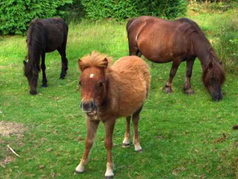 Three ponies, two pregnant mares with heavy swinging bellies, one dark brown and one mid-brown, and a sandy brown foal with rough, shaggy baby hair, about three and a half feet tall. They’re followed by a small sleek-coated black horse with a white bottom, also pregnant, that came right up and snuffled my arm.