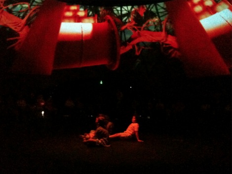 Images: children entranced by 360 artists’ moving image. Photos taken by Kayla Parker 11 August 2012 during the screening of Katerina Athanasopoulou’s animated film Engine Angelic in the 21 metre diameter ICCI 360 dome at Welcome to the Treasuredome artists’ moving image festival, held on Weymouth seafront for Maritime Mix – London 2012 Cultural Olympiad programme. Note: about 100 people are seated on chairs placed around the circumference of the circular screen, with some standing in the spaces by the emergency exits - these are not visible in my iPhone photos because of the low light levels produced by the red hue of this film.