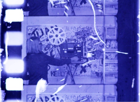 16mm frame from footage shot by Jacqui Knight of me operating Tony Hill’s projector, hand processed in James Holcombe’s CineStar film-making workshop in St Ives (May 2013)Description